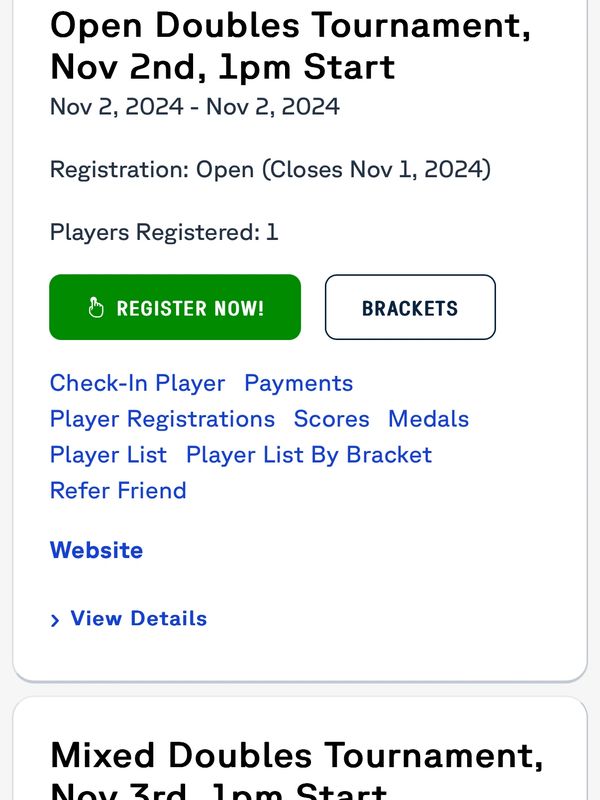 as seen in the image above, a list of events featuring tournaments/leagues that you ”select your partner” will appear here. Click on the “Brackets” button for any listed fixed partner event and it will open the specific skill level page (i.e. 3.0, 3.5, 4.0 etc) that you would like to participate in.